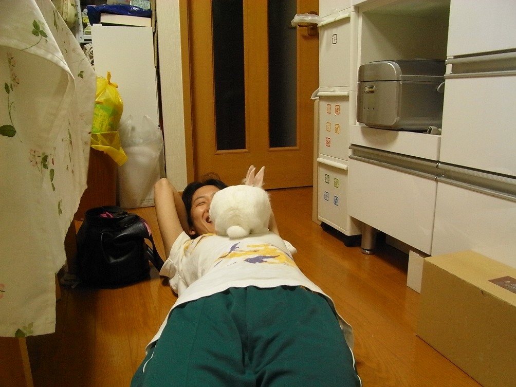 顔を踏まれて大笑いの私。でこ丸出しなのは許して。そして緑のパンツは